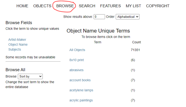 The Browse option groups catalog records based on subject, artist-maker, or object names (Object and Oral History directory), or call number, title or author (Library directory). The list of subjects, titles, authors, etc. may take some time to load, so be patient. This is a place to begin when you may have trouble coming up with keywords to search.