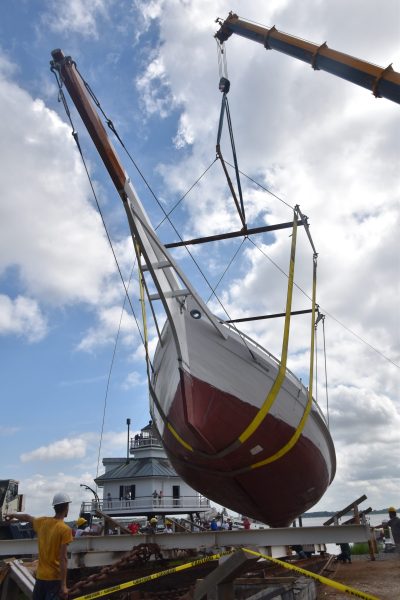 Following a historic two-year restoration project, 1889 bugeye Edna E. Lockwood was relaunched into the Miles River during CBMM’s annual OysterFest in October 2018. Edna, queen of CBMM’s floating fleet, spent several years having her nine-log hull completely replaced by CBMM shipwrights and apprentices. All work was done in full public view in CBMM’s working Shipyard and in adherence to the Secretary of the Interior’s Standards for Historic Vessel Preservation. Shipwright apprentices working on the project were generously supported by the Seip Family Foundation and the RPM Foundation.